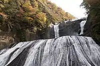 The name of Kuji is thought to have been named after whale (kujira in Japanese). Hitachi no kuni fudoki, one of the existent Fudoki, says, "There were a hill that resembled a whale (kujira). Then the emperor named the land Kuji."[2][5] The river is known for ayu fishing, and in 2006 it had the second largest catch of ayu in Japan after Naka River, which is also located in Ibaraki Prefecture.[1][6] The fishing weir (梁 yana) for tourists is installed along the river in Daigo.[7] Famous Fukuroda Falls are located on Taki River (滝川 Takigawa), which is one of its tributary rivers.[1][8] On midwinter a phenomenon called shiga can be observed in the river. Shiga is a phenomenon in which frazil ice that is generated at the bottom floats on the surface.[9][10] Distribution of freshwater fish like salvelinus and masu salmon captured in Fukushima Prefecture had been restricted after Fukushima Daiichi nuclear disaster, though in Kuji River the restriction was gradually removed.[11]
