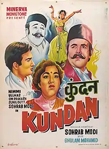 Kundan is a 1955 Indian Hindi-language social drama film produced and directed by Sohrab Modi for Minerva Movietone. The Screenplay was by Pandit Sudarshan, with dialogues by Munshi Abdul Baqui and Pandit Sudarshan. The music was composed by Ghulam Mohammed, with lyrics by Shakeel Badayuni. Nimmi's dual role in the film as mother and daughter was acclaimed critically,[1] while Ulhas won a nomination in the Filmfare Award for Best Supporting Actor category.[2] The film co-starred Sohrab Modi, Sunil Dutt, Pran, Murad, Baby Naaz, Kumkum, Om Prakash and Manorama.[3]