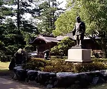A son (Nihon Shoki) or descendant (Kojiki) of Susanoo, Ōnamuji,[23][24] married the goddess Yagami-hime of Inaba Province, earning the jealousy of his eighty brothers, who were seeking for her hand in marriage. Seeking refuge in Ne-no-kuni after his brothers had made attempts on his life,[25] Ōnamuji met Susanoo's daughter Suseri-bime, with whom he immediately fell in love with. Upon learning of their affair, Susanoo imposes four trials on Ōnamuji, each of which he overcame with Suseri-bime's help. Taking his new wife Suseri-bime, as well as Susanoo's sword, koto, and bow and arrow back with him, Ōnamuji – now called Ōkuninushi (大国主 'Master of the Great Land') – defeats his wicked brothers, thereby becoming the lord of Ashihara-no-Nakatsukuni.[26]