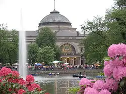 The Kurpark, German for "Spa Park", is a public park in the centre of Wiesbaden, Germany, stretching from the Wilhelmstraße to the southern borders of the district of Sonneberg and lying immediately behind the Kurhaus convention center. It was created in 1852 as an English landscape park and includes a lake where boats can be rented, and a 6 metres (20 ft) tall fountain.[1] It has been described as the most beautiful park in Wiesbaden.[2]