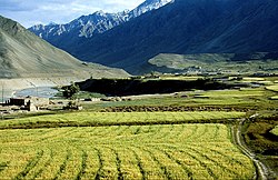 Karsha is at the confluence of the Lungtsi river, which raises from the Lingti peak of Doda basin that forms the Zanskar River. Zanskar takes a turn at Karsha and flows in a northwesterly direction to eventually join the Indus River near Nimmu in Ladakh. Below the Khlangpu peak (5,160 metres (16,930 ft)) of the Zanskar hill range, the river flows in deep ravines near Karsha monastery. It is in this stretch of the Zanskar river in the Lungti and the Doda valleys that there is a maximum concentration of villages.[2]