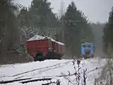 The Kushaverskoye peat railway is located in Novgorod Oblast, Russia. The peat railway was opened in 1967, and has a total length of 16 kilometres (9.9 mi) and is operational as of 2016. The track gauge is 750 mm (2 ft 5+1⁄2 in) and operates year-round.[1]