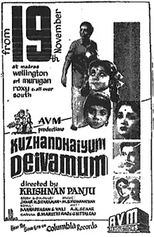 Kuzhandhaiyum Deivamum was adapted from Disney's The Parent Trap (1961) which in turn was based on Erich Kästner's German novel Lottie and Lisa.[1][2] Actor and screenwriter Javar Seetharaman adapted that film in Tamil, making changes in the screenplay to suit the local milieu.[1] AVM Productions chose Krishnan–Panju to direct the film.[3] Jaishankar was selected to play the male lead and it was the third film which featured him in a leading role.[4] Jamuna was chosen to play his character's divorced wife, and Kutty Padmini as the twins.[1] Cinematography was handled by S. Maruti Rao and G. Vittal Rao, art direction by A. K. Sekar,[5] and Panju edited the film under the pseudonym "Panjabi".[1] The climax was shot at Palani.[6]