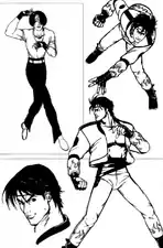 The game's developers decided Kyo's main abilities would be fire-based, alongside the movesets of the other characters in the original Japan Team, who were all inspired by the manga and anime Getter Robo, created by Go Nagai and Ken Ishikawa. The three members of the Japan Team, Benimaru Nikaido, Goro Daimon and Kyo, had personalities similar to those of the main characters from Getter Robo. Kyo was based on the main character, Ryoma Nagare, who had a fiery persona. The elements and the personalities were also a homage to a Japanese phrase about giving birth to fire: "lightning strikes the earth which sparks the flame".[18] According to Morioka,[1] Ikki Kajiwara's Ashita no Joe and Nagai's Devilman manga series were influences too.[19] Artist Nona said he found it difficult to design Kyo as a heroic character due to his dark traits, noting the character was also inspired by Akira Fudo, the protagonist of Devilman.[20] Kyo's pixel art was created by Hiraki, who despite leaving SNK to work on another project a few years later, was asked by Capcom's Kaname Fujioka to once again work on Kyo's design for the crossover game Capcom vs. SNK: Millennium Fight 2000.[21] Artist Falcoon states that Kyo has a strong attitude, making him one of the hardest characters to illustrate,[22] while also noting that his rivalry with Iori Yagami is strong enough to make the duo likable.[23]