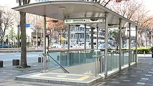 Kyoto Shiyakusho-mae Station (京都市役所前駅 Kyōto shiyakusho-mae eki) is a stop on the Tozai Line of Kyoto Municipal Subway in Kyoto, Japan. It is in Nakagyo-ku. With the station number designation T12, its station color is kara kurenai.[2] Because it lies beneath the Kawaramachi-Oike intersection, the station also carries signs with the name Kawaramachi Oike.
