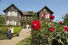 The exterior of the building and the ground floor rooms are designed in the Western style, but the second floor rooms are mostly in Japanese style with tatami mats.[1] The mansion is built on a steep slope of Musashino Terrace. The building is located on the top of a hill, with the Western-style garden on the slope, and Japanese garden on the bottom.[2] The western garden is a complex of Italian style and geometric French style rose garden. On the bottom of the western garden is a Rhododendron plantation which harmonises the western geometric garden and non-geometric Japanese garden.