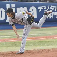 ![]() Fujikawa pitching for the Hanshin Tigers, at Hanshin Koshien Stadium | |||||||||||||||||||||||