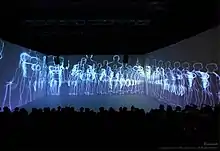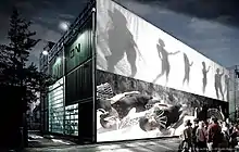 Two recordings of "flexile panoptiosis" are projected onto the façade of the Kunsthalle. The first recording shows the shadows of performers through a lace curtain. The second recording provides an overhead view of the same performance, which appears horizontally and parallel to the first recording. The performance, which takes place in the interior of the building, starts with the appearance of a queen, who is wearing items of fashion that visually symbolize her authority, including a ruffed collar and an elaborate gown, moving across the stage trailed by a procession of followers. All the performers wear the architectural elements of form, structure, material, plan and section as fashion items. At the beginning of the performance, the performers' fashionable accoutrements visually project power to the audience. As the performance proceeds, the performers progressively deconstruct the elements of power. At the end of the performance, the audience is invited to interact with these elements of power, inhabiting the same stage space as the performers, wearing and playing with these fashionable items as toys while appearing as shadows behind the curtain.