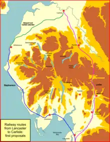 Already in 1835 many observers saw that a trunk line connecting England and Scotland could be expected soon; surveys had already been carried out and routes suggested. George Stephenson had developed two routes, a direct one via Shap following the valley of the River Lune. This involved steep gradients, which Stephenson disliked, and he preferred a route crossing Morecambe Bay by a long barrage, and round the Cumberland coast. This had much easier gradients and would serve numerous populated settlements, but at the expense of considerable extra distance. Stephenson's proposals were not carried forward at this stage. Joseph Locke carried out a series of assessments of practicable routes in the years 1835 to 1837, not all of them actual surveys. In particular, on 4 November 1836 Joseph Locke was commissioned by the Grand Junction Railway to "report on the practicability of making a railway communication between Preston and Glasgow".[4][5] He proposed a route passing east of Lancaster and running up the valley of the River Lune past Kirkby Lonsdale. There was to be a summit tunnel at Shap, 1+1⁄4 miles long, after which the line would descend through Bampton, Askham and Penrith into Carlisle. The steepest gradients were to be 1 in 100. His report was well received, but no progress was made at this stage.[6]