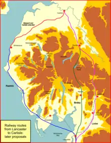Carlisle was not the ultimate destination in these considerations: the issue was a route between the emerging English network and central Scotland. Although Lancaster was an obvious starting point for a westerly route, there were advocates for an eastern route from York. Here too the terrain northwards was a major difficulty: selection of the route of such a line within Scotland was just as controversial as that in England, and it incorporated just as great a difficulty in finding a practicable route.[9][10]