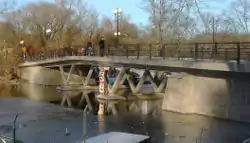 Most likely, an old wooden bridge was found here by the mid 17th century, as this was the location for a custom house dealing with the ships delivering goods to the city from Lake Mälaren. Nevertheless, it is present on a map dated 1733 and was replaced by a new wooden, four-span truss bridge in 1845, 33 metres long, and 6 metres wide. In 1931, the present three-span steel girder bridge was inaugurated; 56 metres in length and 8 metres wide with a roadway of 5.6 metres.[2]