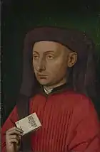 Light falls from the left, leaving traces of shadow on the side of the man's face, a device commonly found in van Eyck's early portraits.[20] He is youthful, and his face has a soft fleshiness achieved through shallow curves and flowing, harmonious brushstrokes, giving the appearance of a relaxed, warm, and open personality, which Meiss describes as evoking an almost "Rembrandtesque warmth and sympathy".[20] The sitter is not handsome; he has a flattish face, a stubby yet pointed nose, and prominent cheekbones that might, according to Panofsky, belong to a "Flemish peasant".[21] Dhanens describes him as having an honest expression.[13]