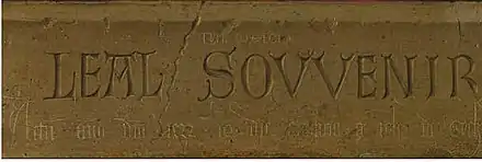 The larger middle inscription is in French, using a 12th-century script. It reads "LEAL SOVVENIR" (Loyal Remembrance, or Faithful Souvenir),[30][31] and is painted to give the impression that it was carved into the parapet.[6] In 1927 Hippolyte Fierens Gevaert put forward Timotheus of Miletus, a Greek musician and dithyrambic poet born c. 446. Gevaert held that the portrait was a commemoration of a court artist who had recently died and that the classical reference was intended to flatter his memory. Panofsky largely went with this position in 1949. He speculated that the sitter was the celebrated musician Gilles Binchois, by 1430 a canon at St. Donatian's Cathedral, Bruges.[14] Campbell is sceptical, disclaiming that the sitter "is not dressed as a cleric".[32] Other theories include that the man was a Greek or Lucchese merchant, Henry the Navigator, Jean de Croÿ or, less likely, that it is a self-portrait. Though there is much disagreement, it is probable that he was a native French speaker, and a notary, poet, or member of the Compagnie du Chapel Vert ("Society of the Green Hat") at Tournai.[32] Dhanens rejects the theory that the man was a musician on the basis that van Eyck would have made this explicit, portraying him holding a device or emblem clearly symbolising music. She concludes that he is an accountant or lawyer holding a legal or financial document.[28]