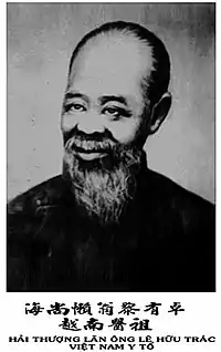 Lê Hữu Trác (1724 in Hưng Yên – 1791 in Hà Tĩnh) or alias Hải Thượng Lãn Ông, was an 18th-century Vietnamese physician who was the best known and most celebrated doctor in Vietnamese history. Hữu Trác was conscripted into the army in 1740 at the age of sixteen. In 1746 he withdrew from the army after his eldest brother died and lived in Hương Sơn District with his old mother. His own son died in a smallpox epidemic in 1758 when he was five. He then spent the next fifteen years in learning medicine, with focus on curing smallpox.[1] He traveled to Hanoi in 1782 in order of lord Trinh Sam to treat the Crown Prince.[2]
