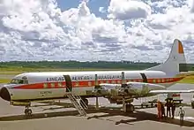 The CV-240s were replaced by three Lockheed L-188C Electra turboprops, which were acquired from Eastern Air Lines in 1969, and were operated for over 20 years.[2] On February 26, 1969, the airline entered into regular operation, with 3 weekly frequencies for Sao Paulo. Once a week, the flight continued to Rio de Janeiro, before returning to Asunción. In 1970, service started to Santa Cruz de la Sierra, Resistencia and Salta with a Douglas C-47 transferred from the Military Air Transport of the FAP. In 1972, La Paz, Bolivia was added to LAP's network. In 1973 a route to Lima was inaugurated and in 1978 to Santiago.