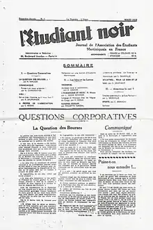 L'Étudiant noir, subtitled Journal mensuel de l’association des étudiants martiniquais en France (roughly translated as "The Black Student, Monthly Journal of the Association of Martinique Students in France"), is a journal created by the Martinican Aimé Césaire in 1935 in Paris. The Guyanese Léon-Gontran Damas published his first pigmentary poems, and Senegalese Léopold Sédar Senghor his first articles, in the magazine while they were students. Damas would define it as "...a corporative and combative journal which aimed to end tribalization and the clan system in force in the Latin Quarter! We ceased to be Martinican, Guadeloupean, Guyanese, African and Malagasy students and became one and the same black student."