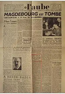 Maurice Schumann was the political editor of L'Aube at the start of World War II (1939–45), writing under the pseudonym of André Sidobre.[11] During the war the paper ceased publication on 10 June 1940, and resumed on 23 August 1944.[4]