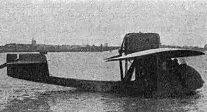 The flying boat had a rectangular section fuselage with a flat, single-step planing bottom. Short sponsons under the wing gave stability on water. Both pilot and passengers sat in open cockpits within a fairing on top of the forward fuselage. The pilot was near the nose, with side-by side rear seats immediately behind him under the wing leading edge. Fuel, carried in a 30 l (6.6 imp gal; 7.9 US gal) tank in the sponsons and another, 30 l (6.6 imp gal; 7.9 US gal) tank in the fuselage was pumped to the engine by compressed air. Behind the step the fuselage was narrow in profile though wider in plan. The tail was conventional with rectangular, broad chord fixed surfaces. A vertical tail, broader than it was high, carried a narrow, straight-edged, conventionally balanced rudder. The tailplane was high on the fin and had, like the aileron, elevators with horn-balances; they had a nick for rudder movement.[2]