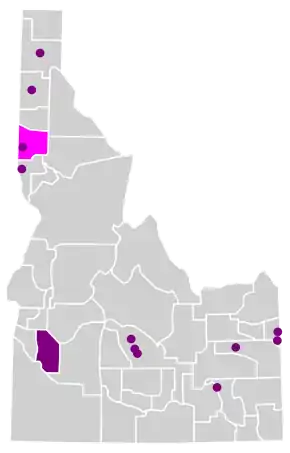 The following Idaho counties and cities have ordinances prohibiting discrimination on the basis of sexual orientation and gender identity (representing about 40% of the state population):[22] Ada County,[23][24] Bellevue,[25] Boise,[26] Coeur d'Alene,[26] Driggs,[27] Hailey,[28] Idaho Falls,[29][30] Ketchum,[26] Lewiston,[31][32] Meridian,[33][34] Moscow,[35] Pocatello,[36] Sandpoint,[26] and Victor.[37] The city of Twin Falls has an ordinance prohibiting city employment discrimination on the basis of sexual orientation only.[31] Latah County bans discrimination against county employees on account of their sexual orientation and gender identity.