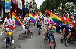 From 18 September 2017 to 24 September 2017, Vietnam's Hanoi Pride took place for a fifth consecutive year. The event hosted thousands of people, compared to only about a hundred at the first pride parade.[63] Irish drag queen Panti Bliss attended the event.[64] The sixth Hanoi Pride took place in November 2018, and saw the participation of more than a 1,000 people. The parade uniquely involves supporters and participants peddling on their bikes to campaign for transgender rights and same-sex marriage in the country.[65][66] Over 35 similar events are held each year throughout Vietnam, including in the cities of Haiphong, Thanh Hóa, Da Nang, Qui Nhơn, Nha Trang, Vũng Tàu, Ho Chi Minh City and Cần Thơ. The events were aired by several Vietnamese television channels, namely VTV4, VTV6 and VTV9.[67][68]