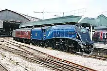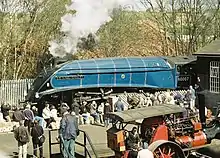 Withdrawn from service by British Railways on 1 February 1966, it was targeted by the A4 Preservation Society, which was soon renamed the A4 Locomotive Society, to rescue the locomotive from the cutter's torch. This was achieved, and the "Streak" was moved to Crewe for refurbishment.[3] Fellow A4 No 60026 Miles Beevor also subsequently visited the former LMS works after its own withdrawal, and its three pairs of 6 ft 8 in driving wheels were transferred to No. 60007 because they were in a far better condition than those on the newly saved engine.[4]
