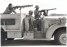 The patrol vehicles were initially armed with 11 Lewis machine guns, four Boys anti-tank rifles and a Bofors 37 mm anti-tank gun distributed amongst their vehicles.[13] By December 1940, the vehicle armaments had been improved and 'T' Patrol, for example, had five .303 Vickers Medium Mk. I machine guns, five Lewis guns, four Boys anti-tank guns and the Bofors 37 mm.[30] Another Vickers gun used was the heavy Vickers .50 machine gun, which would be mounted at the rear of the vehicle.[31] All of the unit's vehicles were armed with at least one gun; each vehicle was fitted with six to eight gun mountings, but normally only two or three of them would be in use.[32]