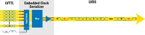 LVDS works in both parallel and serial data transmission. In parallel transmissions multiple data differential pairs carry several signals at once including a clock signal to synchronize the data. In serial communications, multiple single-ended signals are serialized into a single differential pair with a data rate equal to that of all the combined single-ended channels. For example, a 7-bit wide parallel bus serialized into a single pair that will operate at 7 times the data rate of one single-ended channel. The devices for converting between serial and parallel data are the serializer and deserializer, abbreviated to SerDes when the two devices are contained in one integrated circuit.