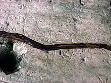 The acropolis is also distinguished by a great quantity of graffiti inscribed onto the stucco interior walls of its rooms, some of which display a considerable level of artistic skill.[21] The graffiti is believed to date to the last phase of occupation of the acropolis, during the Early Postclassic, and includes local fauna and human figures, some of which are playing musical instruments.[37] Animals depicted in the graffiti include a deer, a turtle and a frog.[32] Two human figures are depicted playing flutes,[32] while other subjects include pyramid temples, courtly scenes, vulvas and supernatural beings.[27]