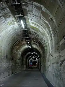 The site reverted to private ownership after the war. As the quarry had long since been worked out, it was abandoned.[22] The tunnels were not destroyed but were sealed off, though at some point they were reopened by local people and could be entered; the octagon remained sealed off with a ceiling-to-floor barricade. The quarry itself remained in almost the same condition as it had been in 1944, with sections of railway track still in place on the quarry floor. The hospital section remained relatively intact and was used by the local gendarmes as a shooting range.[24]