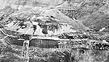 The Allies first noticed construction activity at Wizernes in mid-August 1943 when the Germans began building railway track and the offloading stores into the old quarry.[17] After Hitler authorised the decision to turn the depot into a missile launch site, construction was stepped up. Work on the dome began in November 1943[18] and tunnelling in the cliff face below began in December. At the start of January, Allied reconnaissance aircraft observed an elaborate system of camouflage on the hill top, installed to conceal the dome.[17] The building works were greatly hindered by the constant air-raid warnings, which stopped work 229 times in May 1944 alone. In response to Hitler's desire to see the site completed the workforce was expanded substantially from 1,100 in April 1944 to nearly 1,400 by June.[19] About 60% of the workers were Germans; skilled workers, such as miners from Westphalia, were recruited to excavate the tunnels and build the dome.[20] The remainder were principally Frenchmen conscripted by the Service du travail obligatoire (STO), plus Soviet prisoners of war.[9] The project was overseen by several large German construction companies, with Philipp Holzman A.G. of Frankfurt am Main and the Grossdeutsche Schachtbau and Tiefbohr GmbH serving as the chief contractors.[21]