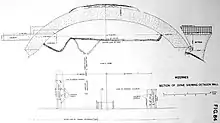 As an additional bomb-proofing method, the dome was surrounded by a bomb-proof "skirt" or Zerschellerplatte of steel-reinforced concrete, 14 metres (46 ft) wide and 2 metres (6.6 ft) thick. This was supported by a series of buttresses, which were not tied into the dome itself, above the entrances to the Gustav and Gretchen tunnels. Another concrete structure was tied into the skirt to the north-west of the dome, which was perhaps intended for use as an observation and control tower. A separate underground building was constructed on the western side of the quarry to serve as a hospital and as offices for the engineers.[23] A Decauville narrow-gauge railway was installed on the quarry floor to transport supplies from the main line to the construction site.[24]
