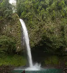 La Fortuna Waterfall (Spanish for "the fortune") is in central Costa Rica, in the Alajuela Province. In Spanish, it is known as Catarata Fortuna. The waterfall drops about 70−75 meters and is at the base of the dormant Chato volcano, about 5.5 km outside of the town of La Fortuna, near the Arenal Volcano. It is fed by the Arenal River,[1] which travels through the rain forest in the Arenal Mountain range until it plunges over the cliff, forming this waterfall.