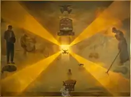 At the top center of the painting, a flat wagon carrying a specialized trailer comes out of nowhere (characteristic of Surrealism), and reminds one of the central themes of the painting, the railway station of Perpignan in France, near the Spanish border in the Pyrenees. The left side of the painting shows embodiment of positive values (the couple on the bags of wheat represent labor, and the man in a meditative pose embodies respect), while on the right of the image are embodied sins and suffering (the man and woman representing lust, and the woman mourning). The two figures flanking the far left and right sides are taken from The Angelus, a well-known pious painting by the French artist Jean-François Millet.[4][5][6][7]