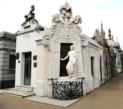 Set in 5.5 hectares (14 acres),[3] the site contains 4691 vaults, all above ground, of which 94 have been declared National Historical Monuments by the Argentine government and are protected by the state.[4] The entrance to the cemetery is through neo-classical gates with tall Doric columns.[12] The cemetery contains many elaborate marble mausoleums, decorated with statues, in a wide variety of architectural styles such as Art Deco, Art Nouveau, Baroque, and Neo-Gothic,[13] and most materials used between 1880 and 1930 in the construction of tombs were imported from Paris and Milan.[14] The entire cemetery is laid out in sections like city blocks, with wide tree-lined main walkways branching into sidewalks filled with mausoleums. These mausoleums are still being used by rich families in Argentina that have their own vault and keep their deceased there. While many of the mausoleums are in fine shape and well-maintained, others have fallen into disrepair.[15] Several can be found with broken glass and littered with rubbish. Among many memorials are works by notable Argentine sculptors, Lola Mora and Luis Perlotti for instance.[16] The tomb of Liliana Crociati de Szaszak, due to its unusual design, is of special interest.