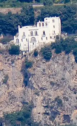 Initially, the property was a part of the Villa Cimbrone, owned by Ernest Beckett, 2nd Baron Grimthorpe. His daughter Lucy (1884–1979)[1] built La Rondinaia around 1930 andtook to living there. It is built on the edge of a cliff, hence its name "The swallows nest" (rondine means swallow in Italian).[2] It has six floors and is 600 square metres (6,500 sq ft) in size. The surrounding garden is 4 hectares (9.9 acres).[3]