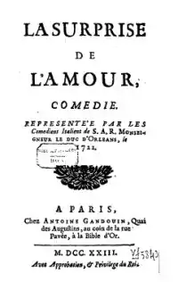 La Surprise de l'amour is a three-act romantic comedy by French playwright Marivaux. Its title is usually translated into English as The Surprise of Love. La Surprise de l'amour was first performed 3 May 1722 by the Comédie Italienne at the Hotel de Bourgogne in Paris. In this play, a man and a woman who've sworn off love are tricked by their servants into falling in love with each other.