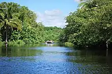 The main attraction, which is unique to this part of the Costa Chica is the lagoon, which is the estuary of the Tonameca River.[1] The lagoon is cut off from the sea by the beach much of the year and is full of mangroves as well as a wide variety of wildlife. The two principle mangrove types here are the red mangrove (Rhizophora mangle) and the white mangrove (Laguncularia racemosa). Tannins from the roots of the red mangrove turn the lagoon's water reddish in the shallows and black in deeper areas.[1] In the mornings, the lagoon fills with the sounds of the many birds that can be found here, including woodpeckers, kingfishers, ducks, storks cormorants, herons and others.[1][3][4] The area also has crustaceans, turtles, deer, and iguanas, but what attracts the tourists are the crocodiles.[1][6] During the rainy season the lagoon meets the sea and prompts sea life such as sea turtles, dolphins and fish to enter to feed on the crustaceans.[6] There is also another mangrove area nearby on the Copalita River.[4] Also nearby is the Rancho El Potrero, where iguanas are hatched and raised.[6]