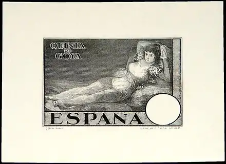 Stamps with naked Maja were privately ordered from the London printer Waterlow & Sons,[1] but the Spanish governmental mail service (Correos) recognized this issue as legitimate in exchange for a part of the circulation. The stated purpose of its distribution was to recoup construction costs of the Quinta de Goya (literally "Goya's country house"),[8] exhibition hall entirely devoted to the works of the Spaniard, where some of his paintings and etchings were placed.[9][10]