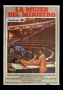 La mujer del ministro (The Minister’s Wife) is a 1981 Spanish film directed by Eloy de la Iglesia and starring Manuel Torres, Simón Andreu and Amparo Muñoz. The complex plot mixes terrorism, politics, corruption and sex in the convoluted politic environment during the Spanish transition to democracy. The film is notable for its lesbian subplot. It was classified S as pornographic for a nude scene in a sauna.[1]