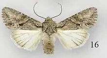 The length of the forewings is 14.2–15.8 mm for males and 13.8–16.9 mm for females. The forewing ground colour is pale grey, with the medial area pale grey brown. The antemedial and postmedial lines are incomplete or absent, when present then best developed toward the anal margin and fading out towards the costa, the antemedial line double, sometimes with slightly paler grey infill. The postmedial line double, often forming pale, indistinct crescent opposite claviform spot. The subterminal area with diffuse dark shading in subapical and anal areas, latter sometimes with a small white crescent. The basal dash is black and crisp and the orbicular spot slightly oblong to slightly kidney shaped, with an incomplete, thin black border and the interior slightly paler than the ground colour. The reniform spot with incomplete thin black border, the interior slightly paler than the ground colour, with indistinct, darker inner ring. The male hindwings are bright, slightly pearlescent white with the terminal third of the veins, and thin diffuse margin fuscous. The female hindwings are duller white overall with more extensive fuscous shading on the veins and marginal area. Adults have been recorded on wing from mid-August to late September.