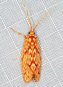 The wingspan is 26–32 mm. The forewings are pale yellow with red lines. There is a narrow line along the costa and another along the inner margin, the basal portion is broad and the median portion sometimes obsolete. There is a short streak along the basal part of vein 12 and a streak along vein 11 to the costa. The cell is broadly outlined, incompletely so along the submedian, crossed towards the base by an oblique line which is prolonged to dorsum. Beyond this, it is divided by a median line, each division containing a short longitudinal streak. There is a strong line from the end of the cell to the dorsum. Veins 2 to 10 are outlined. The hindwings are reddish.[3]