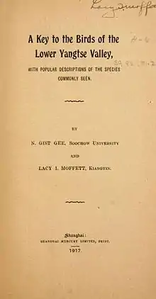 - Gee, N. G.; Moffett, L. I. (1913). "Check List of Birds of the Lower Yangtze Valley from Hankow to the Sea". Journal of the North Branch of the Royal Asiatic Society.
