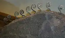 Carl V. Solver visited the Ladby ship in 1940 and measured the anchor and chain and removed links from the chain to be analyzed at the State testing laboratory.[55] Solver estimated that the chain contained roughly 60 links and was a total length of roughly 10–12 meters in length.[56] In a later publication, Solver estimated the number of links in the chain to be about 50, with a total length of about 10 meters .[57] When the anchor-chain was cleaned in 1994, it was discovered that Solver's measurement of the first link was incorrect.[58] Solver stated that the length of this link was 10 centimeters, while the 1994 survey conducted by archaeologists has shown that it is only about 15 centimeters long.[59] Corrosion has altered the appearance of the links: the iron has cracked from contact with the soil and flakes off in large pieces on contact.[60] Cleaning the chain revealed that the individual links—which unlike the exposed links still contain a high percentage of iron—are not the same size.[61] The chain consists of at least 78 differently shaped links, the smallest of which is 13 centimeters.[62] Because the chain links were rusted together, it has not been possible to estimate whether the different types of links were arranged according to a system—for example with the smallest links gathered together immediately after the anchor itself.[63] The total length of the chain cannot be calculated exactly, but given an average length per link of 17.9 centimeters, the chain is probably about 11 meters in length.[64]