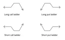 A long call ladder consists of buying a call at one strike price and selling a call at each of two higher strike prices, while a long put ladder consists of buying a put at one strike price and selling a put at each of two lower strike prices.[1] A short ladder is the opposite position, in which one option is sold and the other two are bought.[1] Often, the strike prices are chosen to make the ladder delta neutral.[1] All three options must have the same expiry date.[1]