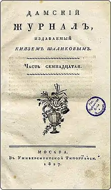 For the polemic with critics, the Anti–Journalism column was created – it was mainly led by Peter Shalikov and Mikhail Makarov.[9] In addition, in 1824, the publication provided its pages to Peter Vyazemsky,[10] who was excommunicated from almost all magazines, and who, after the publication of the Pushkin's "Bakhchisarai Fountain", entered into a literary polemic with the poet Mikhail Dmitriev. The discussion was initiated by Dmitriev in Herald of Europe; Vyazemsky's response was the articles "On Literary Hoaxes", "Analysis of the Second Talk, Published in No. 5 of the Herald of Europe" and "My Last Word", published in the Ladies' Magazine – they listed the "errors" of the opponent, and he was called "prose poet and non-art prose writer".[11]