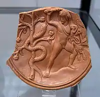 The dragon (Ladon) image coiled around the tree, originally adopted by the Hellenes from Near Eastern and Minoan sources, is familiar from surviving Greek vase-painting. In the 2nd century CE, Pausanias saw among the treasuries at Olympia an archaic cult image in cedar-wood of Heracles and the apple-tree of the Hesperides with the snake coiled around it.[5]