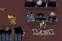 Lady Sia is a traditional platformer with action-adventure elements. As such, players have to watch out for numerous enemies as well as make sure not to fall off of the platforms.[1] The world Sia must cross is divided into four areas, each of which are divided into four levels, a main boss fight, and a bonus level.[1] Levels focus on either fighting or acrobatics. Sia has three lives per level, but the player can temporarily acquire more by collecting gems. If the player loses a life, he or she must restart at the beginning of the level or at the last checkpoint. Checkpoints are found halfway through each level and usually depicted as golden whirlwind images that turn into an image of Sia when activated. If all lives are lost, Sia is "thrown in jail" and the player receives ten seconds to decide whether to restart the level or quit.