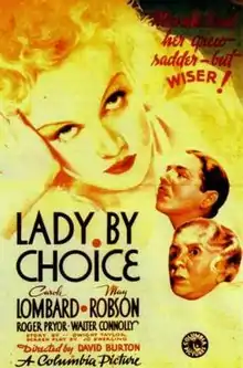 Lady by Choice is a 1934 American romantic drama film released by Columbia Pictures starring Carole Lombard as a fan dancer and May Robson as a homeless drunk who is asked to pose as the dancer's mother for a publicity stunt, with unexpected consequences. Promoted as a follow-up to Frank Capra's 1933 hit Lady for a Day (1933), it resembles the earlier film only in its choice of leading lady, May Robson.[1]