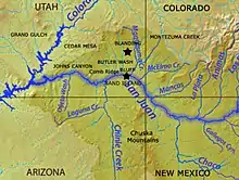 Laguña Creek also formerly also known as Tyende Creek,[1]: 36–37, 81, 94, 100, 106 is a stream in the Navajo and Apache Counties of Arizona. Laguña Creek has its source at 36°41′15″N 110°30′36″W, at the confluence of Long Canyon and Dowozhiebito Canyon at an elevation of 6325 feet / 1928 meters at the head of Tsegi Canyon. Its mouth is in the Chinle Valley at its confluence with Chinle Wash which together forms Chinle Creek, at an elevation of 4774 feet / 1455 meters. Chinle Creek is a tributary of San Juan River which is in turn a tributary of the Colorado River.[2]
