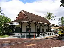 The Lahaina, Kaanapali and Pacific Railroad (LKPRR) is a steam-powered, 3 ft (914 mm) narrow gauge heritage railroad in Lāhainā, Hawaii. The LKPRR operated the Sugar Cane Train, a 6-mile (9.7 km), 40-minute trip in open-air coaches pulled by vintage steam locomotives. The tracks connect Lahaina with Puukolii, stopping briefly at Kaanapali. A narrator points outs sites of interest during the trip, which crosses a 325-foot (99 m) curved wooden trestle whose elevation yields panoramic views of neighboring islands and the West Maui Mountains. The line is currently not operating and all equipment is stored west of Lahaina.